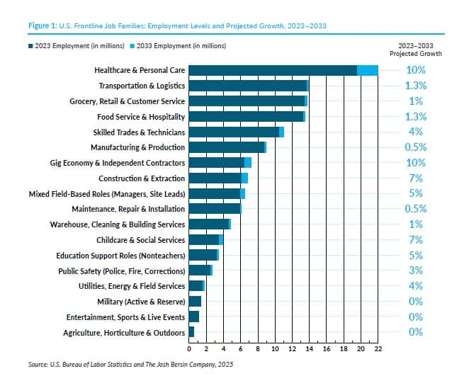 Let’s talk about frontline workers, the most in-demand workforce in the world. These are the nurses, drivers, hotel workers, restaurant staff, airline employees, cleaners, technicians, and manufacturing workers we rely on every day. Our research shows that almost 80% of all workers (by number) take on these jobs, and their total wages are $6.5 Trillion in the US alone.