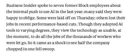 We actually did a huge study of org redesign around AI last year and through 70+ companies found that most companies who looked at AI as a tool to increase individual productivity did not find much job reduction. It takes re-engineering to see anything close to what Block is talking about. (We detail this in The Rise of the Superworker and our study on Dynamic Work Design.)