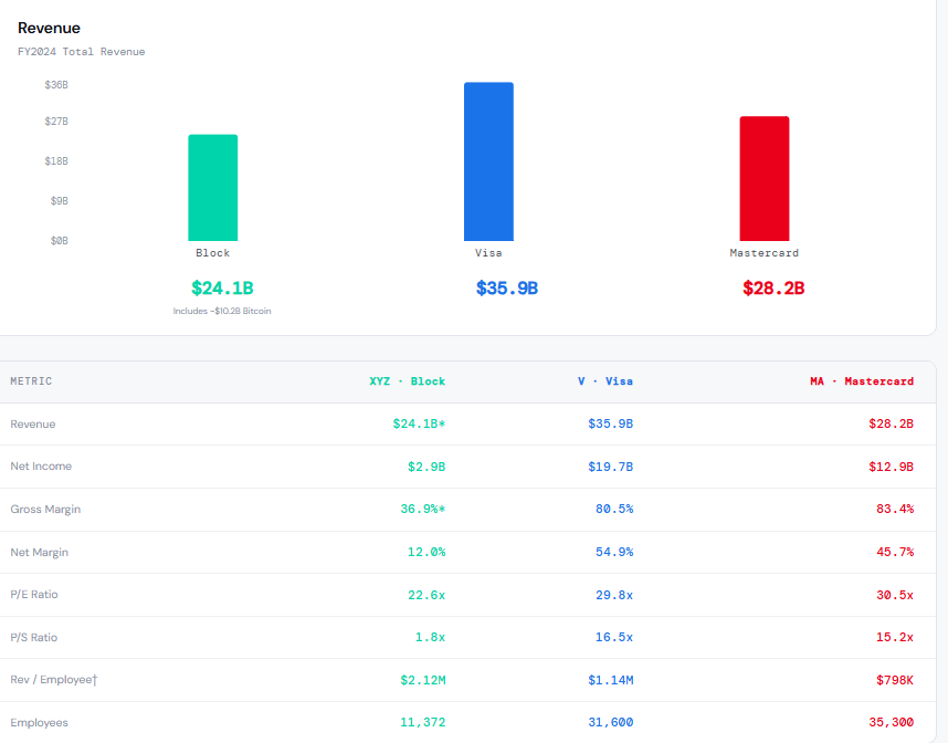 I took some time to compare Block’s financials compared to Visa and Mastercard and Shopify (different businesses but somewhat comparable). What you see is that Block is far less profitable and has less than half the gross margin of the others, indicating that the company is not operating at “scale.”