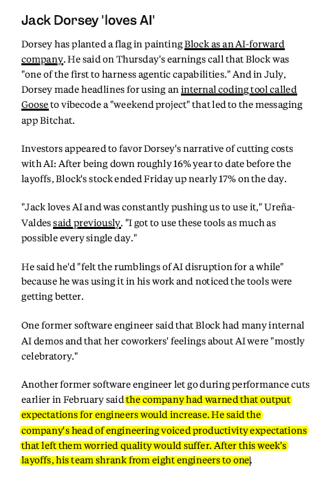 I don’t know Dorsey but I do remember the layoffs at Twitter after Elon Musk found enormous amounts of bureaucracy when he took over. It’s possible that in this case AI is a great excuse to clean up the org chart.