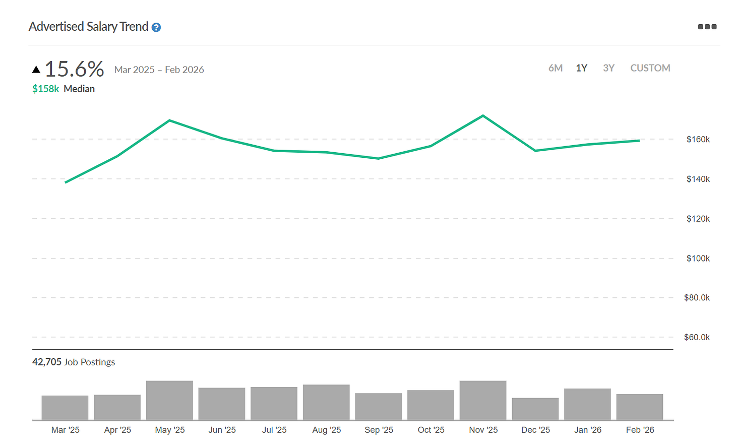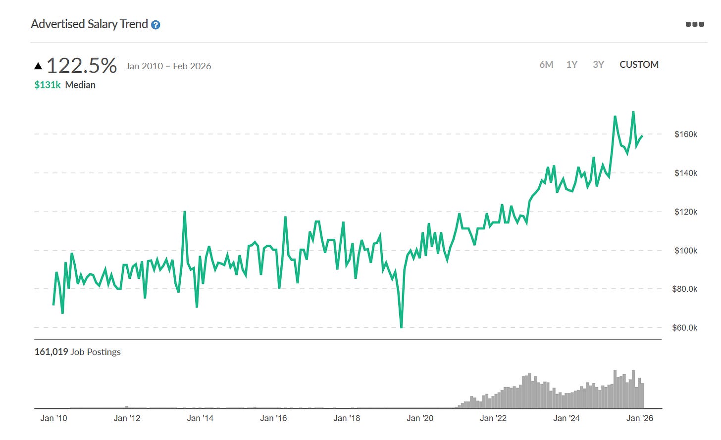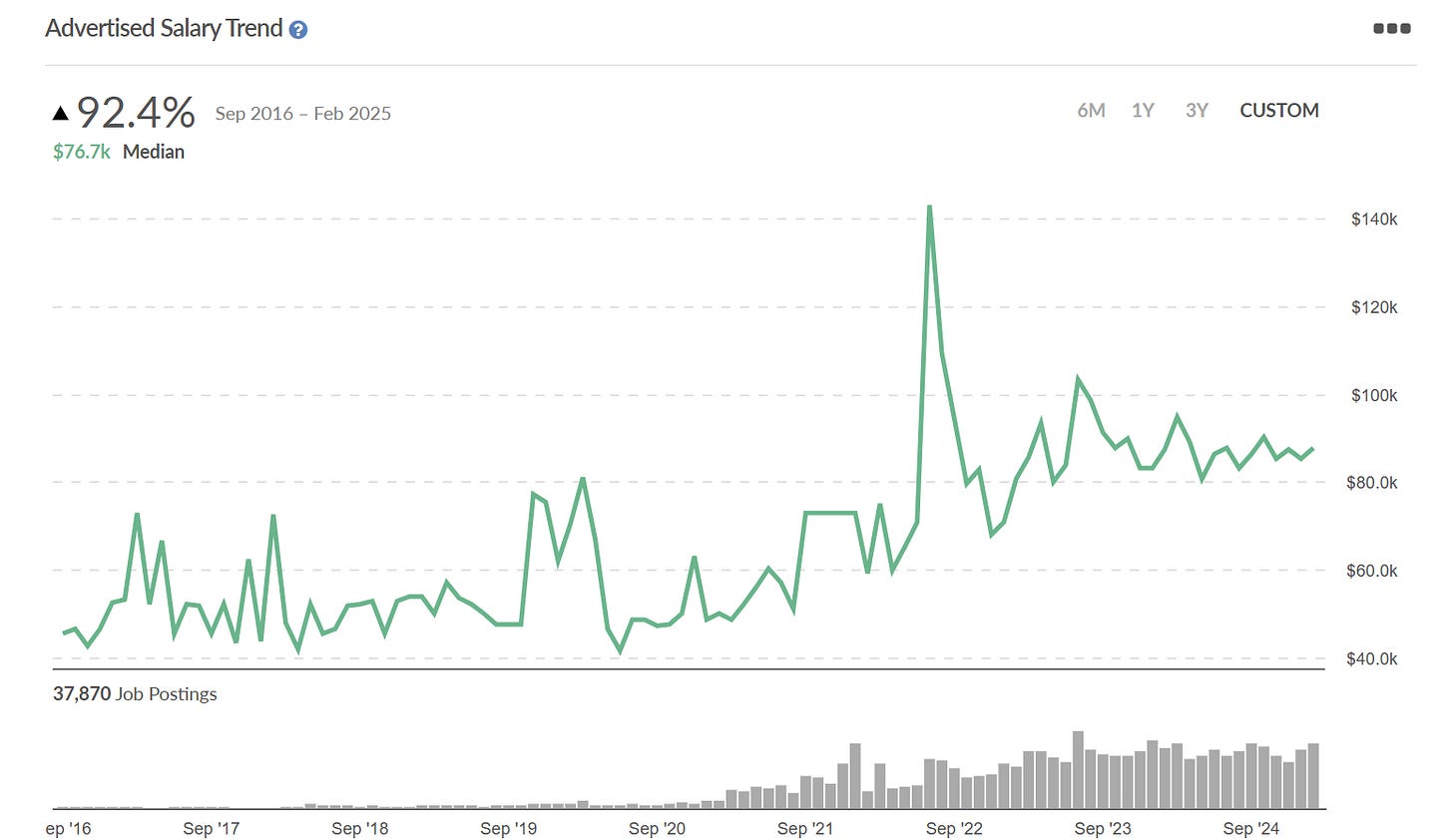 Let’s look at salaries. They’ve steadily climbed also (not as fast as software engineers, but you can see they’re significant).