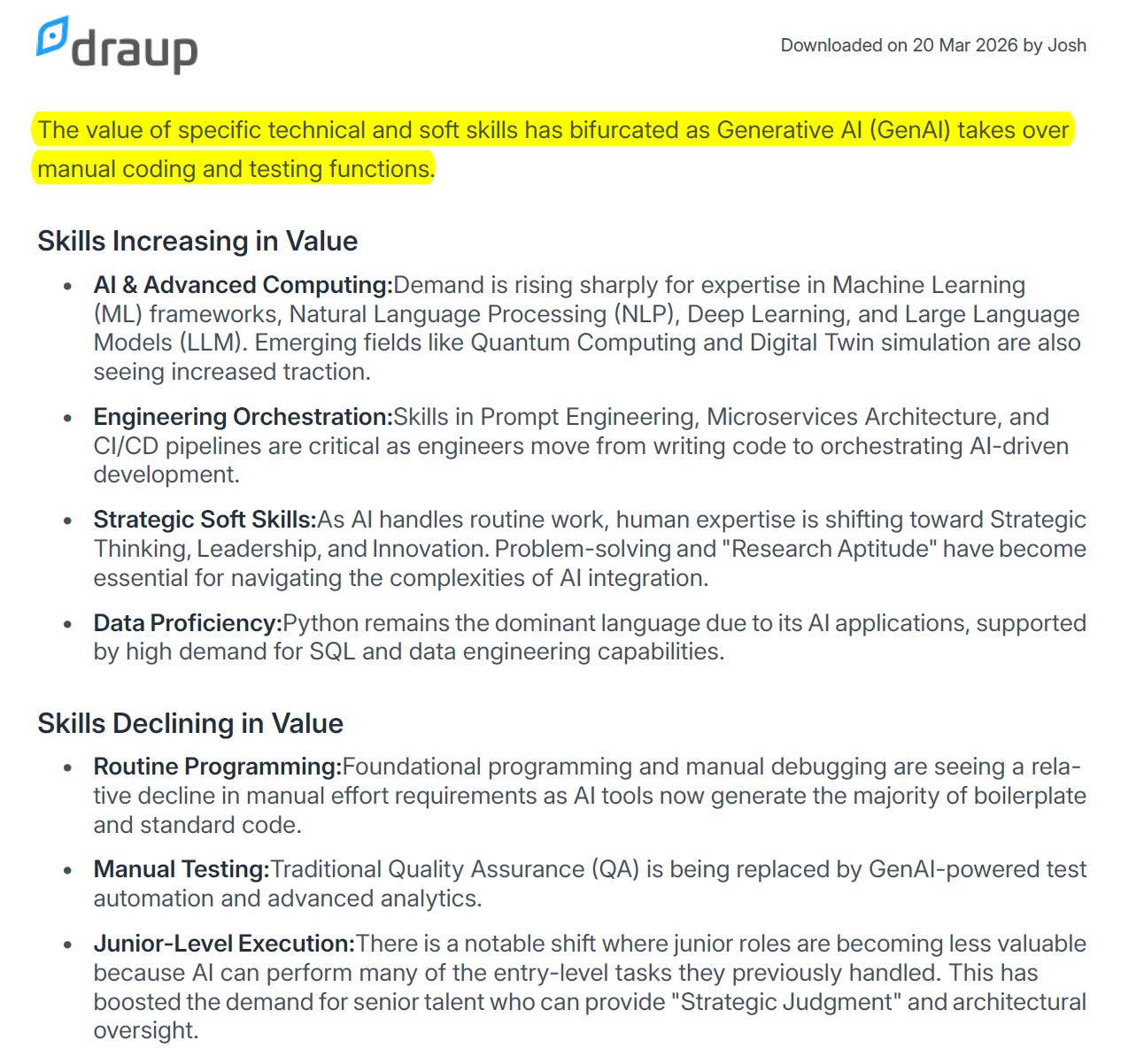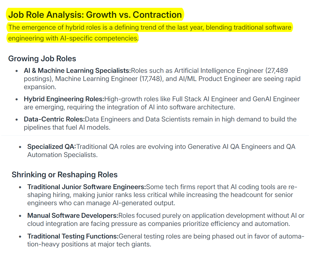New Superjobs include “full stack AI engineer” or “GenAI engineer” and AI/ML product engineer. Job titles which are being replaced are more general coding, testing, and QA.