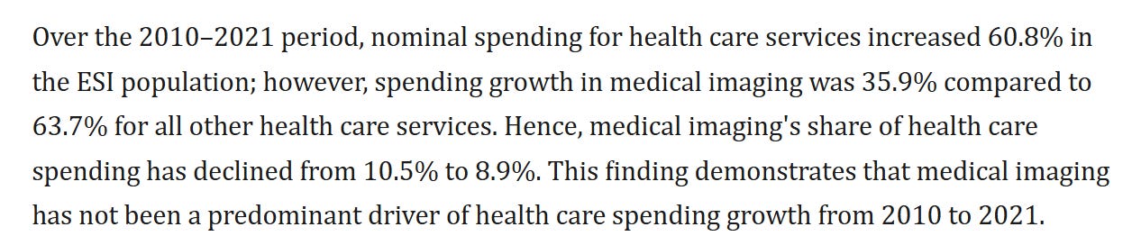 The cost of imaging has decreased (when compared to the soaring cost of other health services) and the volume has skyrocketed. Here are the studies.
